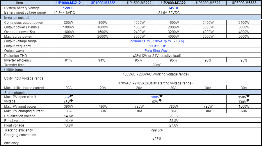 24V : 1000W,max pv input 100V,Max. PV charging current 30A,Max. PV input power 780W.
